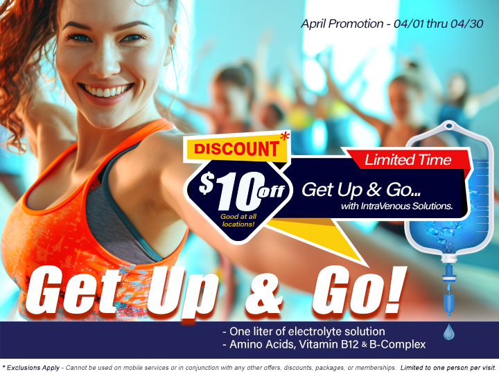 Includes one liter of electrolyte solution, including Amino Acids, Vitamin B12 & B-Complex starting April 1st through April 30th