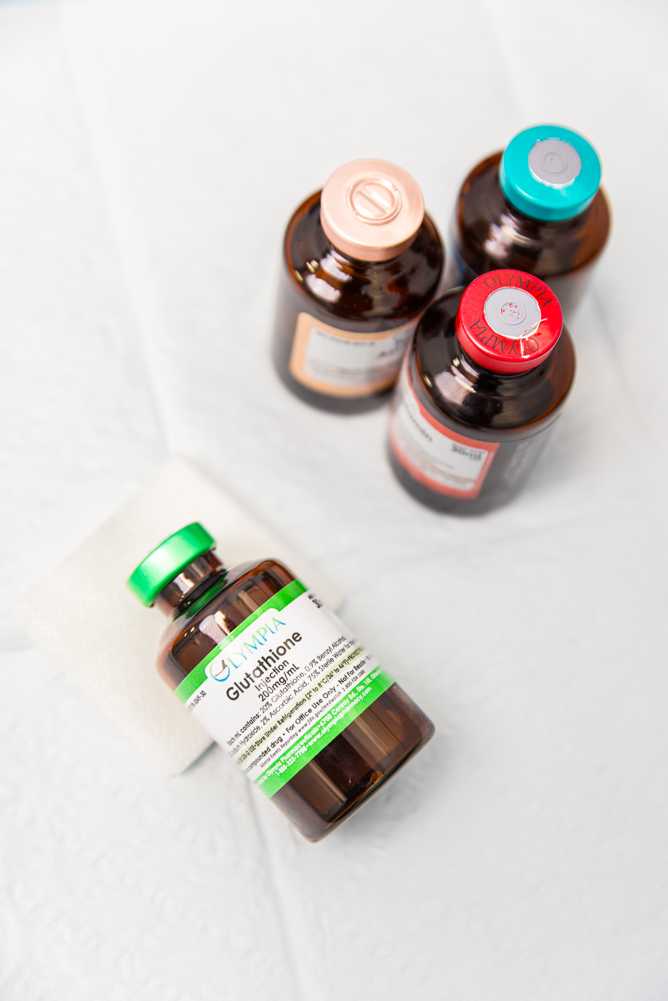 NAD+ (the oxidized form of NAD your body needs), The Works (electrolyte solution, vitamin C, zinc, magnesium, vitamin B complex, vitamin B-12, glutathione)