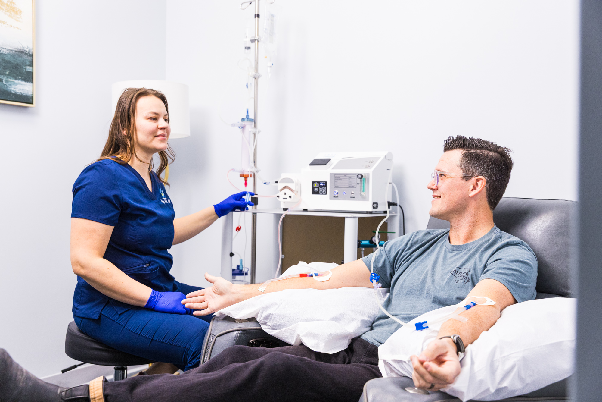 A registered nurse will explain every step of the process, starting with collecting a small blood sample. We’ll combine this sample with sterile oxygen and painlessly infuse the solution back into your bloodstream through an IV. You’ll have about an hour to relax as your body absorbs these nutrients, so feel free to bring a book or headphones!