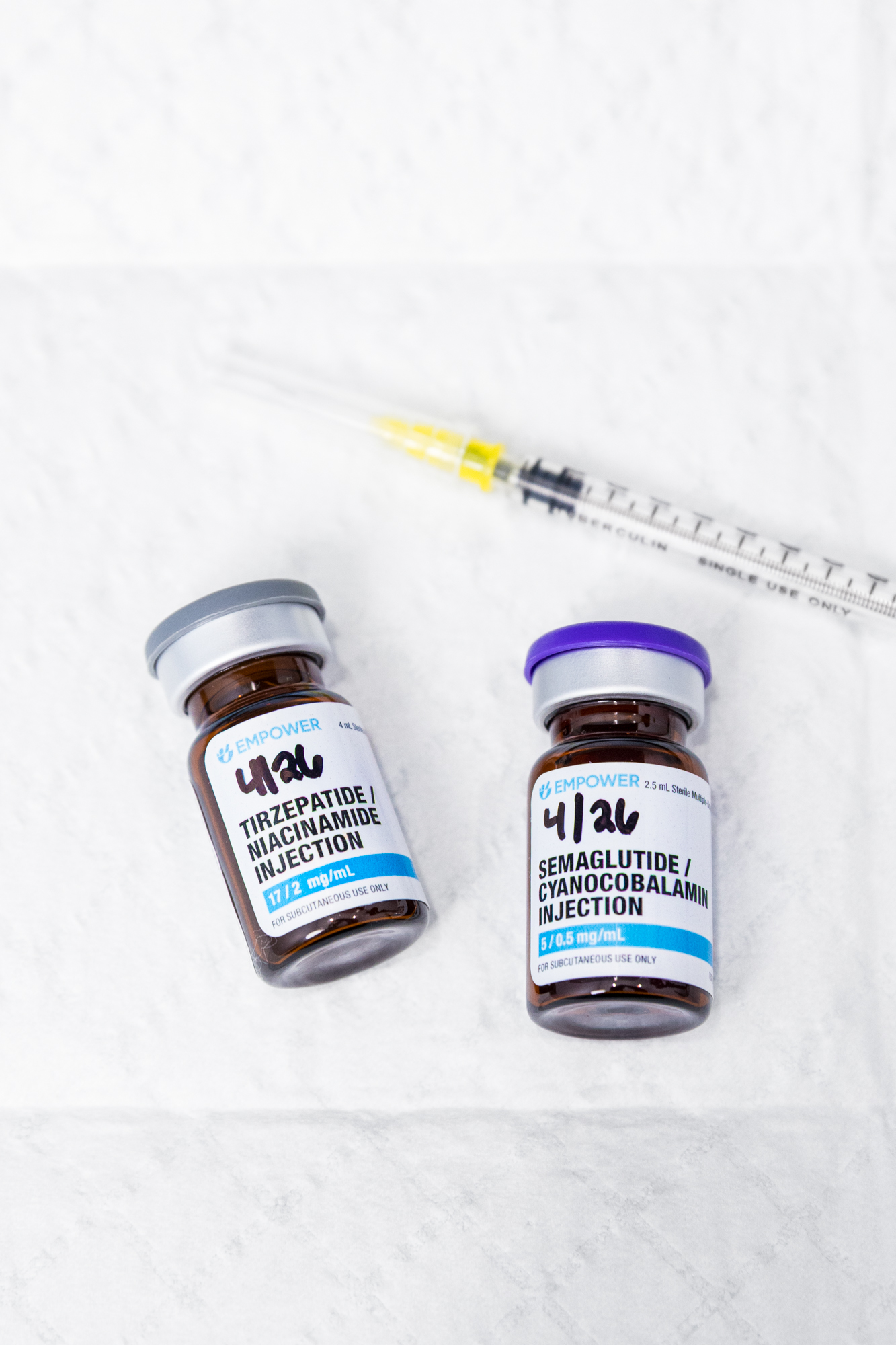 Semaglutide and tirzepatide are the leading weight loss injectables. Both formulas mimic GLP-1 receptor agonists, a naturally occurring substance that your gut secretes during digestion to create the sensation of “fullness”. Tirzepatite is a dual agonist, also imitating GIP hormones (glucagon receptors), the secondary hormone responsible for sending these signals. Every client’s starting point, end goal, and medical history are unique, so our providers will work with you to determine which solution best aligns with your weight loss journey.